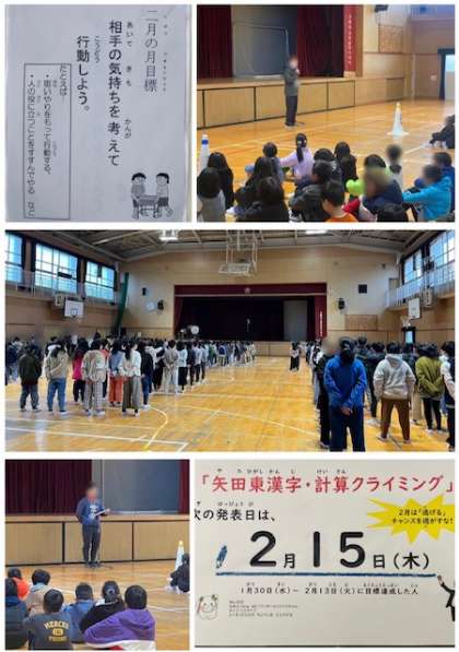 校長先生から、今月から週に3日保健室に来てくれる先生の紹介と、生活指導の先生からは2月の生活目標や学校生活の約束事(学習に必要のないものを持ってこないことなど)についてのお話がありました。また、学力向上の先生からは、矢田東漢字・計算クライミングについてのお話もありました。
