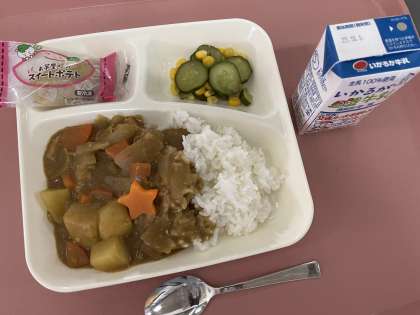 2月5日(月)の献立は「チキンレバーカレーライス・牛乳・きゅうりとコーンのサラダ・スイートポテト」でした。