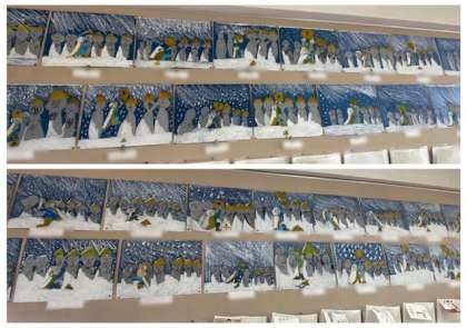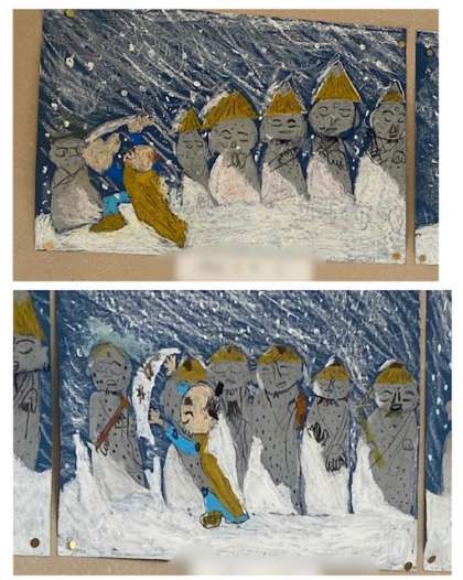 かさこ地蔵の絵を描きました。雪がしんしんと降るなか、おじいさんがお地蔵さんに笠をかけています。