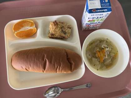 2月9日(金)の献立は「黒糖パン・牛乳・押麦のグラタン・豚肉と野菜のスープ・デコポン」でした。