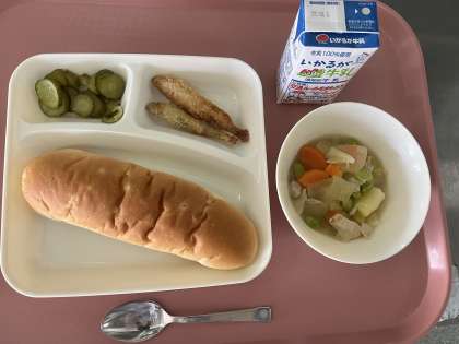 2月13日(月)の献立は「おさつパン・牛乳・わかさぎフライ・洋風煮・きゅうりのピクルス」でした。
