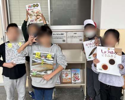 来週に予定している6年生のうどん屋さんの出前授業に合わせて、大阪市の図書館から「和風だし」と「うどんなどの和食」の図書を借りました。「かつおぶし」や「だしこんぶ」などの「だしのうま味の秘密」や「うどんの作り方」が載っている本を約20冊選書してもらいました。