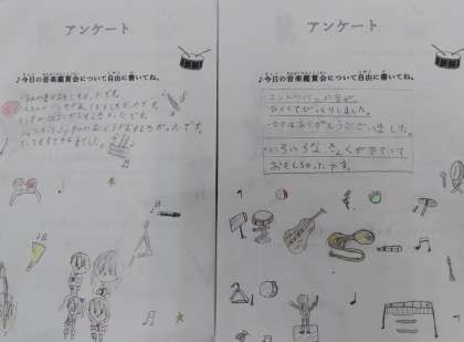 「知っている楽きがたくさんありました。ベースとだ楽きのあいしょうがとてもよかったです。楽しいきょくをたくさん聞かせてくださってありがとうございます。また音楽かんしょう会をしてほしいです。」