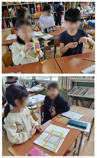 算数科の「はこの形」の学習で、ひごを使ってはこの形を作りました。必要なひごの数、頂点(黄色のジョイント)の数を予想して、ペアで組み立てることができました。