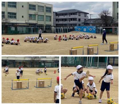 1年生は、体育でボールけりゲームを学習しています。ねらったところに思いっきりけりました。