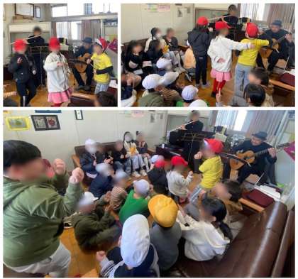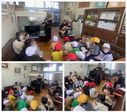 演奏が始まると、子どもたちが集まってきてくれました。軽快なリズムのギター、流れるような音色のフルートが合わさって、とても心地よい音楽になりました。