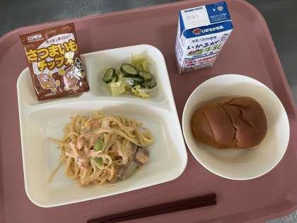 3月15日(金)の献立は「黒糖パン(小)・牛乳・さけのクリームスパゲッティ・キャベツときゅうりのサラダ・おさつチップス」でした。