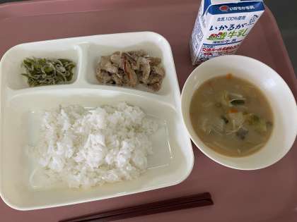 4月10日(水)の献立は「ごはん・牛乳・豚肉のしょうが焼き・とうふのみそ汁・じゃこピーマン」でした。