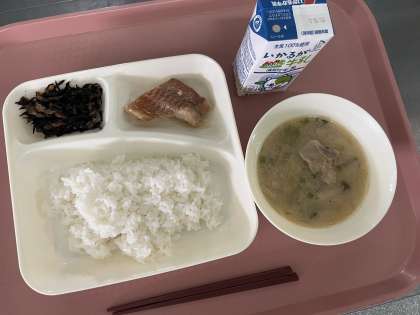 5月20日(月)の献立は「ごはん・牛乳・あかうおのしょうゆだれかけ・豚汁・ひじきのいため煮」でした。