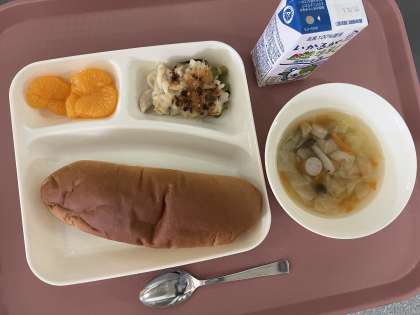 5月21日(火)の献立は「黒糖パン・牛乳・マカロニグラタン・キャベツのスープ・みかん(缶)」でした。