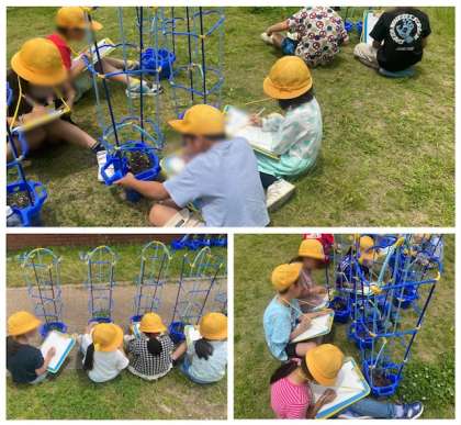 ミニトマトの観察をしました。「前より大きくなってる」「くきが太くなったで」成長をしっかり観察できていました。
