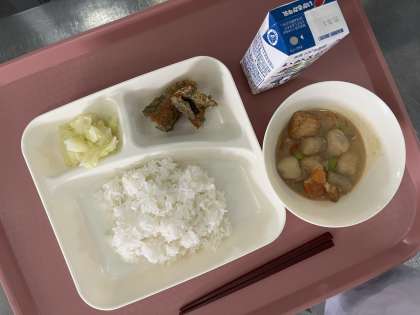 5月23日(木)の献立は「ごはん・牛乳・ちくわのいそべあげ・あつあげとさといものみそ煮・あっさりキャベツ」でした。
