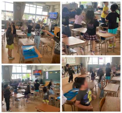 今日のお昼の時間は、英語のモジュールがありました。映像に合わせて歌って踊って、楽しく活動していました。