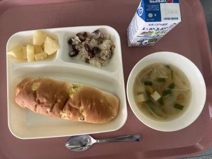 5月24日(金)の献立は「おさつパン・牛乳・金時豆の中華おこわ・中華スープ・パインアップル(カット缶)」でした。