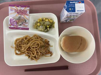 5月28日(火)の献立は「ミニコッペパン・牛乳・ミートソーススパゲッティ・レタスとコーンのサラダ・いもけんぴフィッシュ」でした。