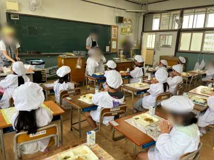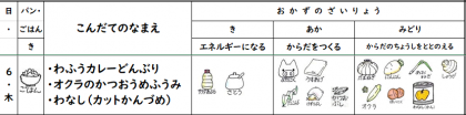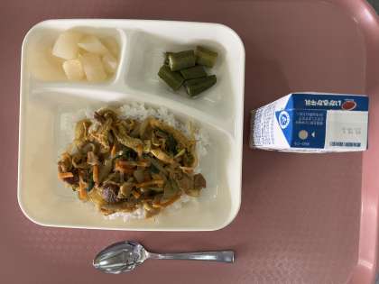 6月6日(木)の献立は「和風カレー丼・牛乳・オクラのかつお梅風味・和なし(カット缶)」でした。
