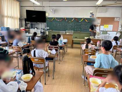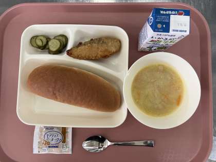 6月7日(金)の献立は「コッペパン(みかんジャム)・牛乳・サーモンフライ・豆乳スープ・きゅうりのバジル風味サラダ」でした。
