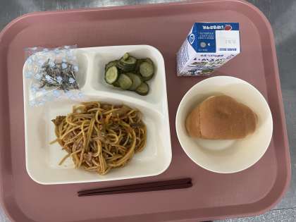 6月11日(火)の献立は「ミニコッペパン・牛乳・カレースパゲッティ・きゅうりのピクルス・ミニフィッシュ」でした。