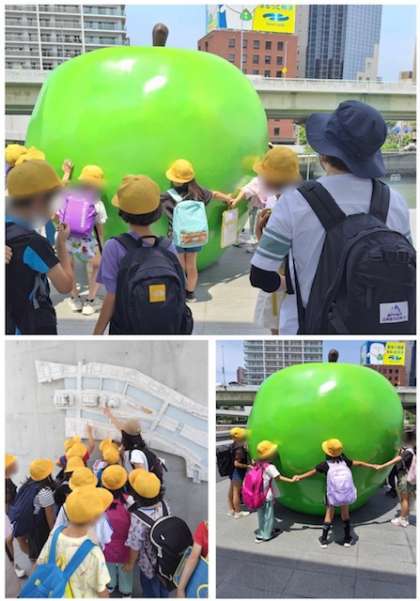 建物の前には、大きな大きな青リンゴがありました。みんなで手をつないで囲むと・・・。