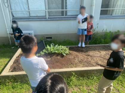 南校舎の裏側に学習園があります。4年生は朝、水やりと一緒に観察しにきています。