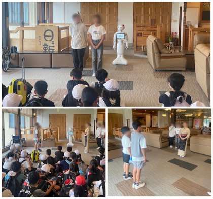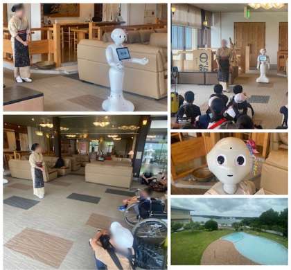 宿舎に到着して開舎式をしました。旅館の方とペッパーの「かしこ」さんが出迎えてくれました。とてもきれいな旅館です。一泊二日、よろしくお願いします。