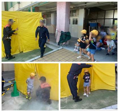煙体験も行いました。火災で発生する煙を疑似体験できます。2人1組でテントに入りました。「前がまったく見えへん」出てきた子どもがびっくりしていました。