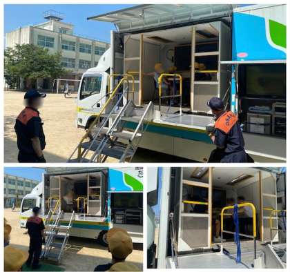 関東大震災や阪神淡路大震災など、さまざまな地震のゆれを体験できる起震車も来てくれました。いすに座ってもいられないゆれを実際に体験しました。