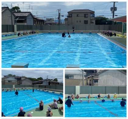 セミが鳴き始めました。気持ちのいい天候で、3年生がプールに入っています。