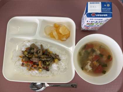 7月10日(水)の献立は「夏野菜飯・牛乳・パワースープ・トロピカルゼリー」でした。