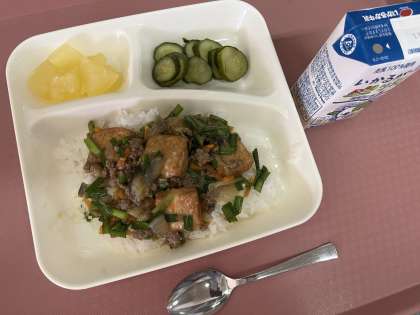 今日から給食も始まりました。8月27日(火)の献立は「マーボーあつあげ丼・牛乳・あっさりきゅうり・りんご(カット缶)」でした。