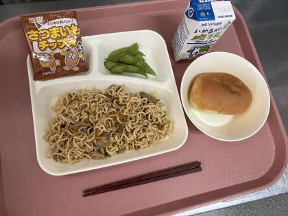 8月30日(金)の献立は「ミニコッペパン・牛乳・焼きそば・えだまめ・おさつチップス」でした。
