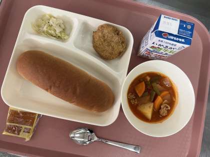 9月2日(月)の献立は「コッペパン(アプリコットジャム)・牛乳・チキンレバーカツ ケチャップ煮・キャベツのバジル風味サラダ」でした。