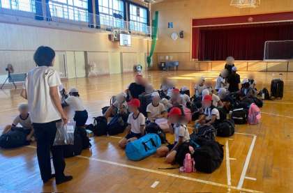 今日から3日間、神鍋高原に林間学習です。天気はバッチリ、5年生が集まり始めました。まもなく出発式をして出発します。