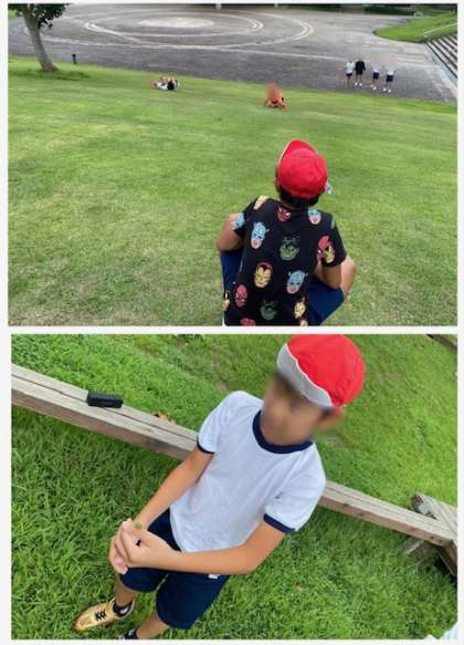 ご飯の後は芝生の坂を転がったり、昆虫やカエルを見つけたらしていました。