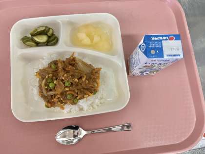 9月5日(木)の献立は「大豆入りキーマカレーライス・牛乳・きゅうりのサラダ・洋なし(カット缶)」でした。