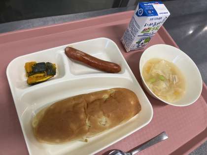 9月11日(水)の献立は「おさつパン・牛乳・ウインナーのケチャップソース・スープ・焼きかぼちゃ」でした。