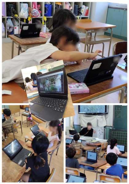 1年生の生活科では、学校にいる生き物をタブレットのカメラで撮り、その後SkyMenuで共有をしましま。1年生もしっかり1人一台パソコンを使っています。