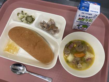 9月17日(火)の献立は「コッペパン(マーマレード)・牛乳・鶏肉のバジル焼き・ベーコンと野菜のスープ煮・キャベツときゅうりのサラダ」でした。