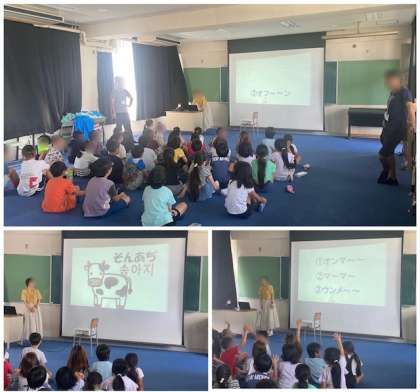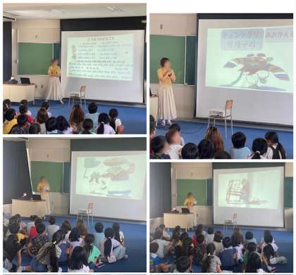 韓国、朝鮮の文化について、ソムセンニンから教えていただきました。動物の鳴き声をクイズ形式で知ったり、カエルの歌を韓国、朝鮮の言葉で歌ったりしました。最後は「アマガエルのお話」の読み聞かせをしてくださいました。