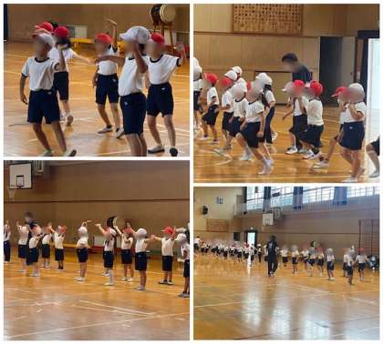 体育館からかわいいかけ声が聞こえてきました。小学校に入学して初めての運動会です。一生懸命団体演技の練習をしていました。