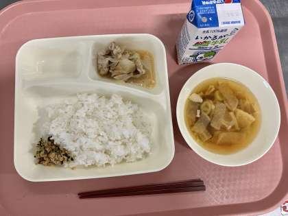 10月3日(木)の献立は「ごはん・牛乳・鶏肉のゆず塩焼き・ソーキ汁・ツナ大豆そぼろ」でした。