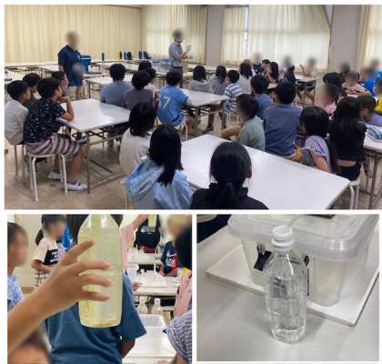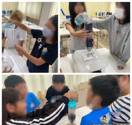 最後に活性炭を通して、汚れていた川の水がとてもきれいになりました。簡単な装置で、水を浄化する仕組みを教わりました。ありがとうございました。