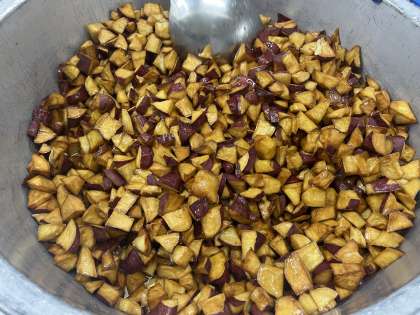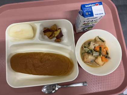 本日の給食の献立は「パンプキンパン・牛乳・中華煮・大学いも・りんご」でした。