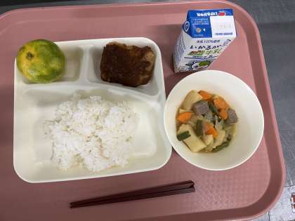 10月16日(水)の献立は「ごはん・牛乳・みそカツ・じゃがいもと野菜の煮もの・みかん」でした。