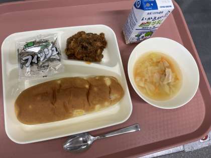 10月17日(木)の献立は「おさつパン・牛乳・なすのミートグラタン・鶏肉とキャベツのスープ・ミニフィッシュ」でした。
