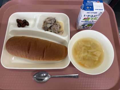 11月5日(火)の献立は「黒糖パン・牛乳・豚肉のバジル焼き・スープ・うずら豆のグラッセ」でした。