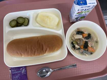 11月8日(金)の献立は「コッペパン(ブルーベリージャム)・牛乳・鶏肉ときのこのシチュー・きゅうりのピクルス・りんご」でした。