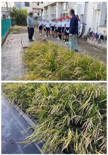 6時間目に、5年生が校舎の東側で育てた田んぼの稲刈りをしました。