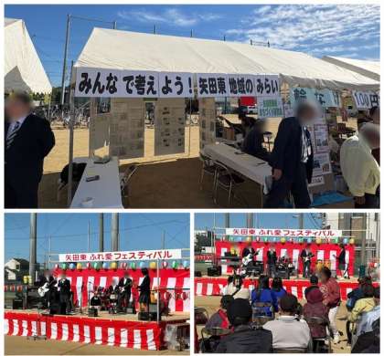 「みんなで考えよう!矢田東地域のみらい」としたテントで、矢田東のまちの歴史の展示があったり、地域の人の意見を聞くコーナーがあったりしました。また、矢田中学校の軽音学部の演奏があったり、ダンス部のパフォーマンスがあったりと、とても楽しく盛り上がりました。ミニSL(機関車)も登場して、子どもたちも手を振って乗っていました。