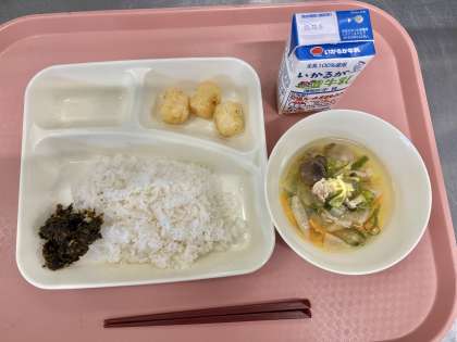 11月11日(月)の献立は「ごはん・牛乳・いかてんぷら・五目汁・のりのつくだ煮」でした。